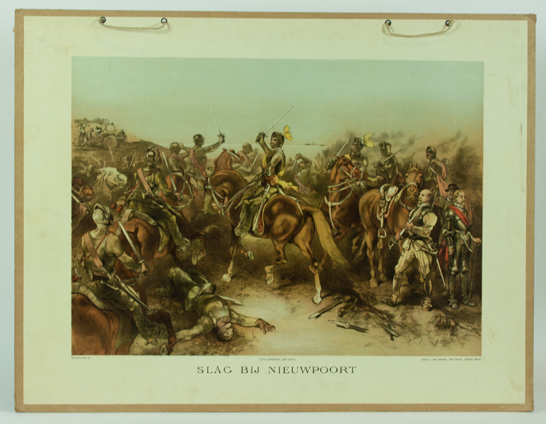Schoolplaat in kleur getiteld: 'Slag bij Nieuwpoort'. Op de voorgrond een gevecht met bewapende mannen te voet en op paard. Onder afbeelding diverse opschriften. Langs bovenzijde twee touwen door ophangogen om schoolplaat op te hangen.