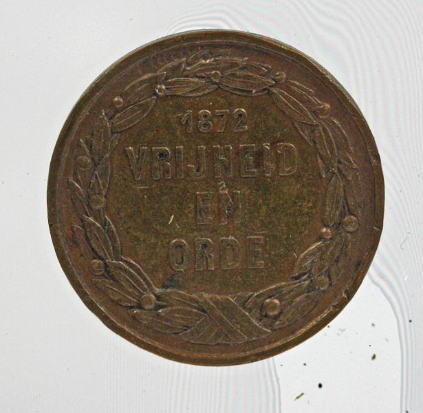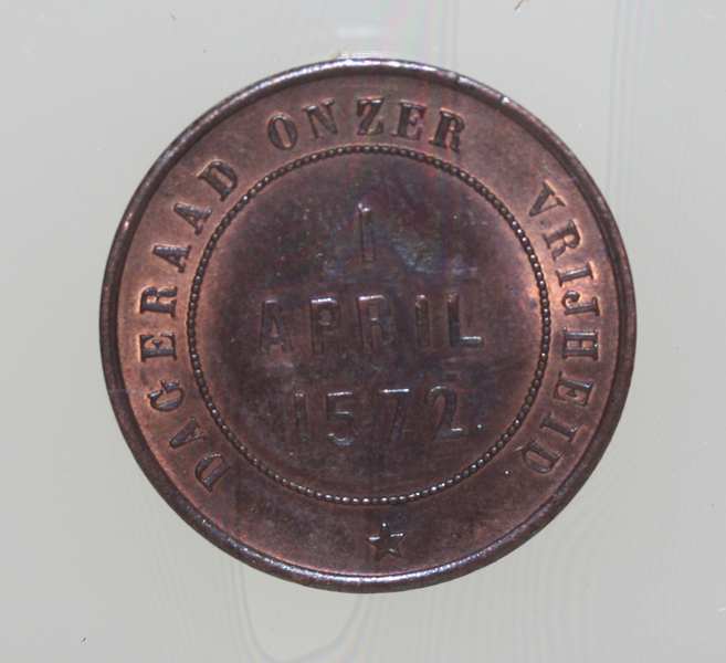 Lijst met zwat geprofileerde rand met daarin twee gedenkpenningen ter aan de derde eeuwfeest van de Iname van den Briel 1872. De bovenste penning betreft een bronskleurige gedenkpenning. Op de voorzijde een afbeelding van de Hollandse leeuw die de kluisters heeft verbroken en een rondschrift '‘DOOR GODS ZEGEN, ORANJES HULP EN NEERLANDS EENDRACHT’. Op de ...