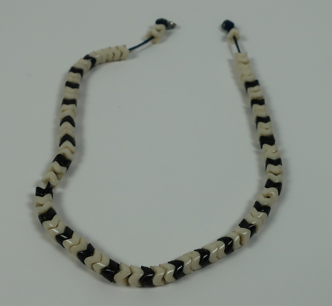 Halsketting gedragen door Maaike van Rietschoten (1929-1943). De ketting bestaat uit zwart/witte kunststof kralen.