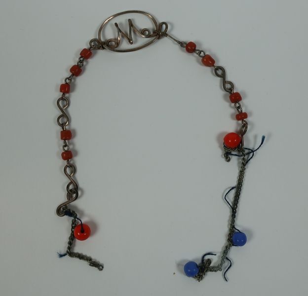 Armband gedragen door Maaike van Rietschoten (1929-1943). Armband van metaal voorzien rode en blauwe kraaltjes. In het midden een metalen ovaal met daarin de letter M.
