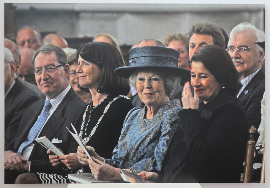 Foto in kleur, groot formaat op metaal, gemaakt tijdens de opening van het heringerichte museum van Brielle op 31 maart 2012 in de Catherijnekerk. Op de voorgrond koningin Beatris gekleed in blauwe jurk met blauwe hoed. Links van haar Marijke Holtrop (directeur museum) en rechts van haar Betty van Vliegen (toenmalige burgemeester Brielle) .
