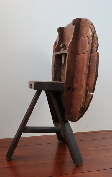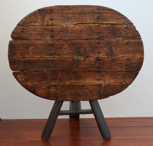 Donkerkleurige ovalen houten tafel. De tafel is inklapbaar, mogelijk gebruikt als bijzettafel. Tafel bestaat uit drie poten en het bovenblad is voorzien van grove planken met diverse schroeven.