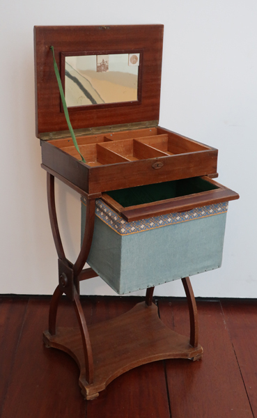 Naaitafel, mahoniehout, op vier poten, voorzien van uitschuifbare wollade en afsluitbare houten lade. Wollade in houten frame bekleed met licht grijs/blauwe stof voorzien van een sierrand in blauw/oranje. Bovenblad kastje kan als klep omhoog waaronder opbergvakken. Klep aan binnenkant voorzien van een spiegel.