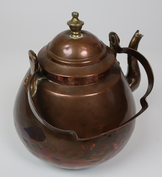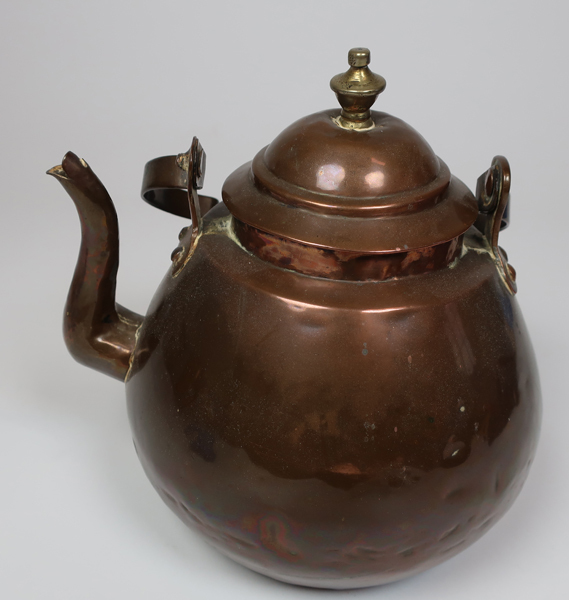 Koperen theepot met tuit en hengsel. Voorzien van losse deksel met knop. Onderkant is zwart.