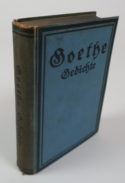 Boek zijnde een dichtbindel getiteld: 'Goethe Gedichte'. Boek heeft een blauwe kaft voorzien van een titel in zwart en een zwarte dubbele kader. Randen bladzijden bovenkant donderblauw gemaakt.