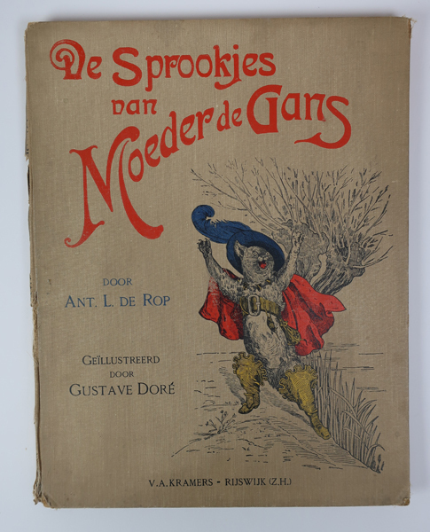 Boek, kinderboek getiteld: 'De Sprookjes van Moeder Gans'. Boek heeft een beige kaft met titel in rode letters. Op de voorkaft een gekleurde afbeelding van de gelaarsde kat. Voorzien van 40 gravures naar tekeningen van Gustave Doré. Geheel in grote letters gedrukt. Inhoud boek: Een meegedeeld gesprek, Klein Duimpje, De Toverfee, Roodkapje, Blauwbaard, De gelaarsde ...