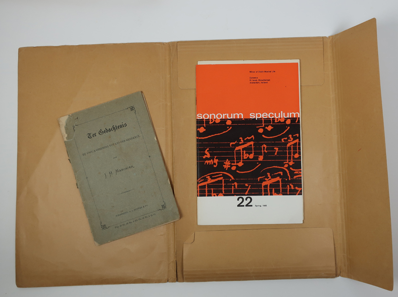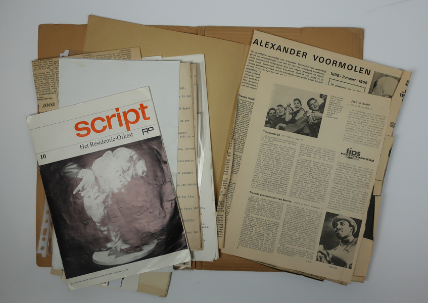 Bruine map of documentenmap waarin diverse documenten van de familie Voormolen. Inhoud: krantenartikelen (ca 14 stuks) over de componist Alexander Voormolen. uitgetitkte documenten met informatie en genealogie van familie Voormolen, uitgave van tijdschrift 'Script het residentie-orkest nr 10' met daarin artikel over de 75-jarige Alexander Voormolen, Sonorum Speculum uit 1965 met o.a. lijst van composities ...