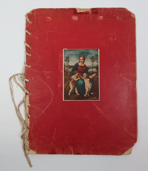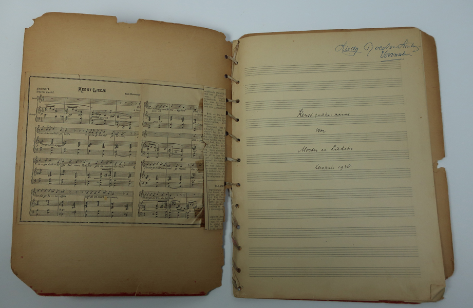 Rode map bijeen gehouden door linnen linten met op de voorkant een gekleurde afbeelding van Maria met twee kinderen rondom haar schoot. Inhoud van map is o.a. bladmuziek getiteld: 'Kerst - liedje van oom Alex uit het vaderland 1926, Daar is een Kindeke geboren op d'aard. O kerstnacht schoner dan de Dagen, Stille Nacht Heilige ...