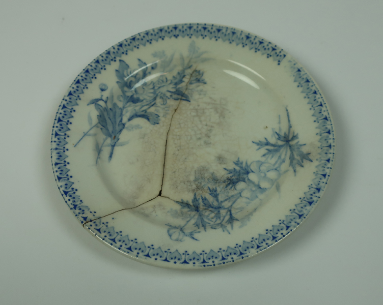 Bord zijnde een gebaksbordje, crème, voorzien van blauwe decoratie. Aan onderkant gemerkt. Gebaksbord hoort bij een kinderservies.