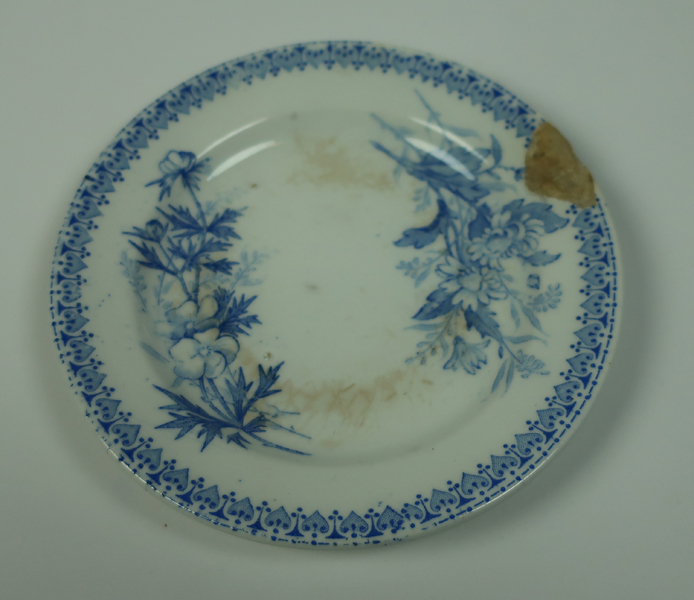 Bord zijnde een gebaksbordje, crème, voorzien van blauwe decoratie. Aan onderkant gemerkt. Gebaksbord hoort bij een kinderservies.