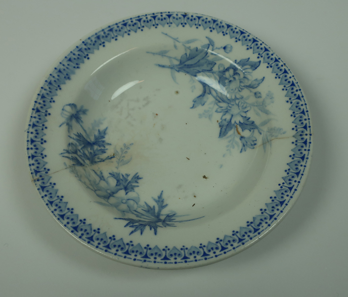 Diept bordje, crème, voorzien van blauwe decoratie. Aan onderkant gemerkt. Bord hoort bij een kinderservies.