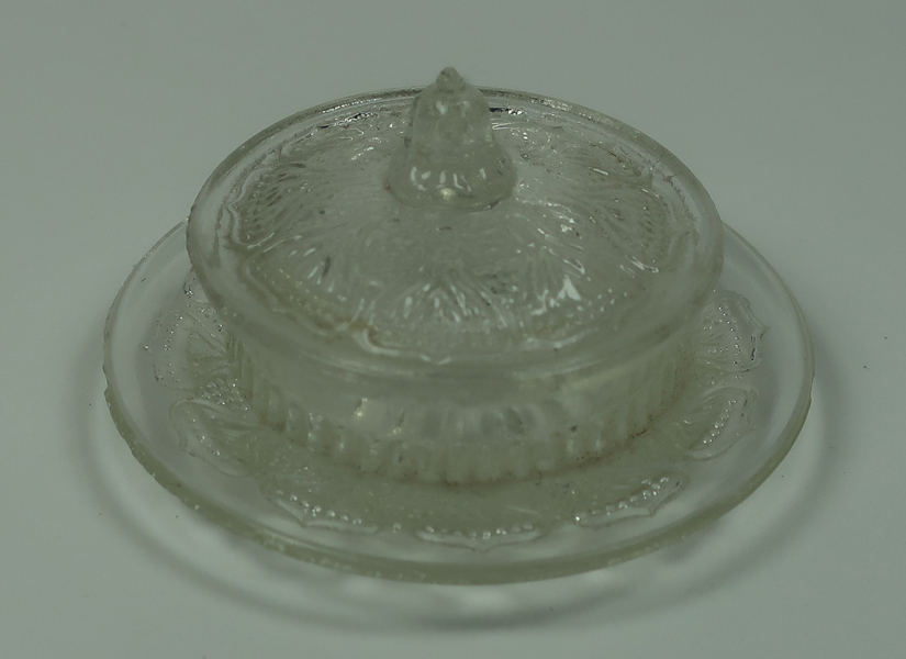 Glazen botervloot versierd met reliëf en voorzien van een glazen deksel met knop. De botervloot is rond en staat vast op een schotel. Botervloot gebruikt als speelgoed.