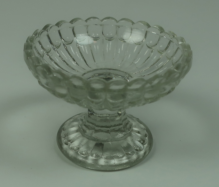 Klein glazen bonbonschaal of bonbonière. Schaal heeft een geschulpte rand en staat op een voet.