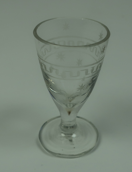 Klein glazen borrelglas voorzien van ster- en meandermotief. Borrelglas behorende bij kinderspeelgoed.