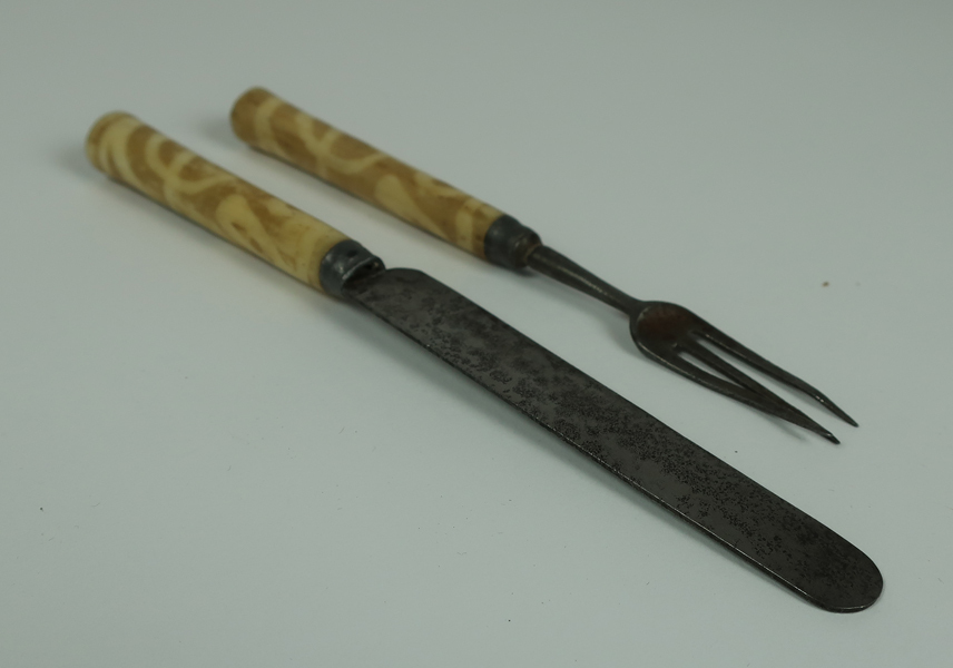Vork en mes behorende bij speelgoed. Tafelvork en tafelmes hebben een bewerkte ivoren handvat.