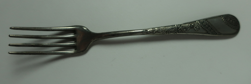 Vork behorende bij speelgoed. Steel van vork bewerkt met o.a. florale motieven. Achterkant voorzien van een merk