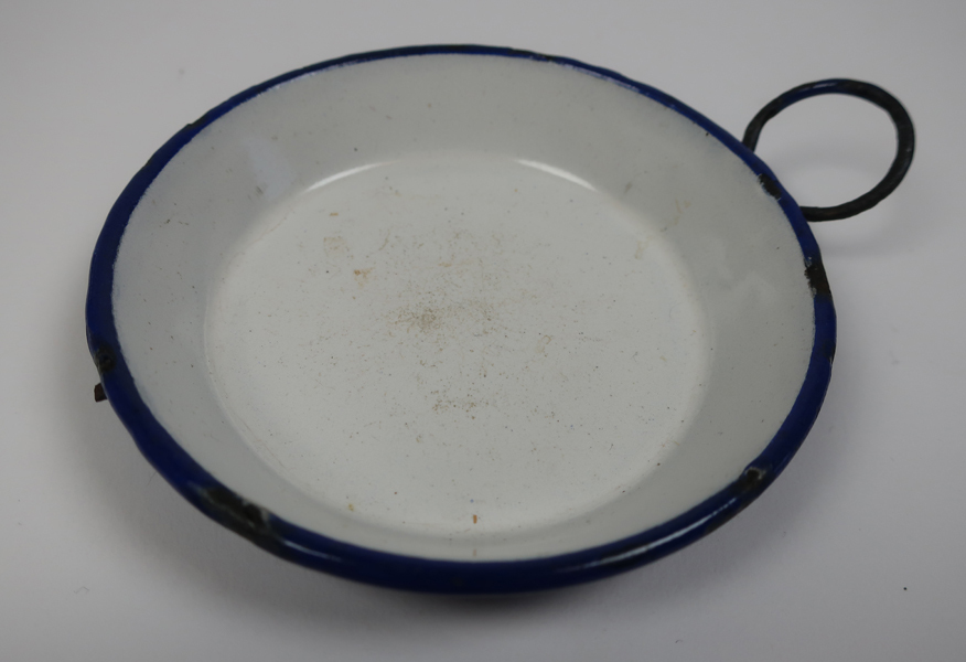 Kleine pan met blauwe buitenkant en witte binnekant zonder handvat maar wel voorzien van een grote oog aan de bovenrand. Mogelijk bedoeld als ophangoog. Pan behorende bij speelgoed.