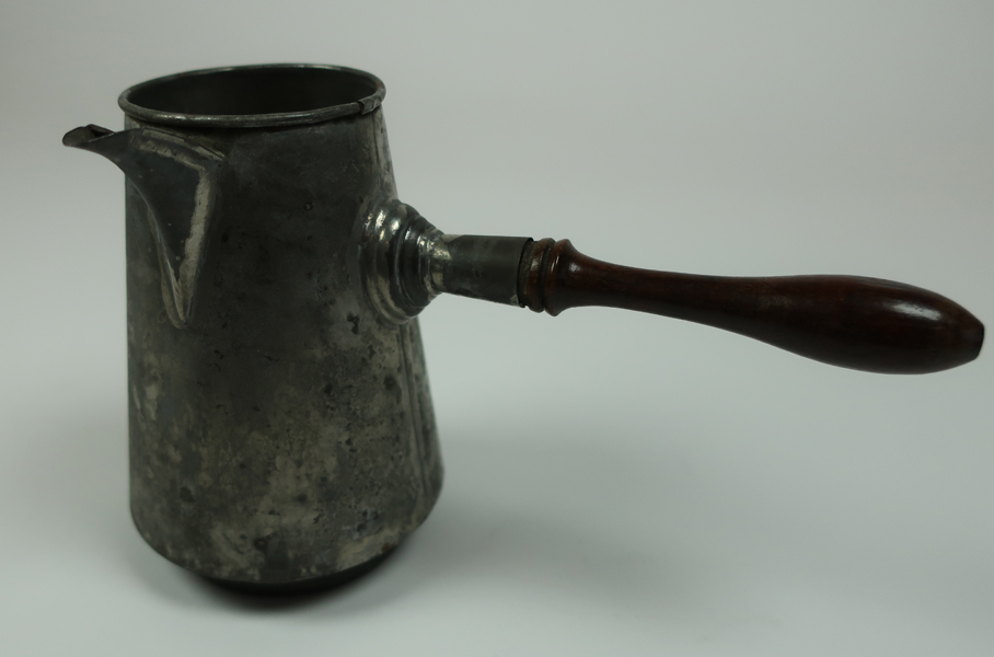 IJzeren koffiekan voorzien van tuit en extra lange handvat. Behorende bij een speelgoedfornuis.