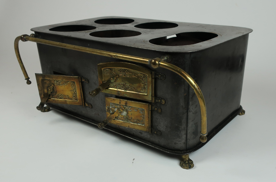 Fornuis op poten, zijnde een kinderfornuis, bestaande uit een bovenplaat met vier ronde gaten en één ovalen gat. Aan de voorkant voorzien van drie geelkoperen deurtjes die als ingang van een oven dienen. Voorzien van koperen stang. Fornuis is daadwerkelijk gebruikt.