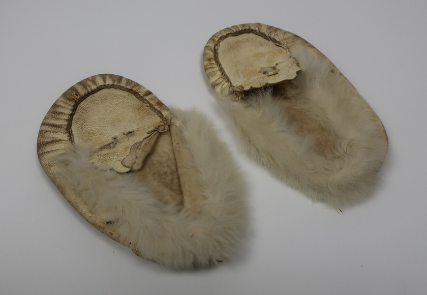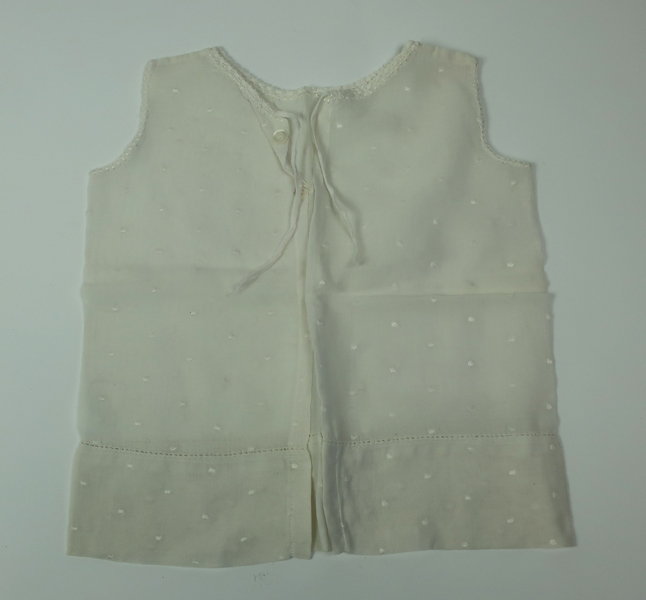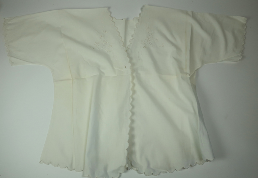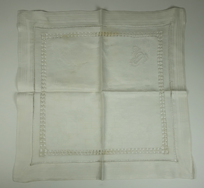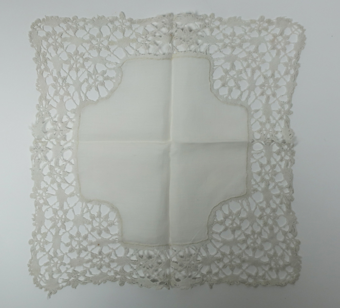 Doos met diverse textilia, waaronder: twee ronde kleedjes, paar babysloffen met bont, vijf theekdoeken voorzien van monogram en naaikant, vijf kleedjes of zakdoeken met versierde rand, acht hemden groot, twee hemden klein, mutsje, een kleed, twee jurkjes voor een baby.