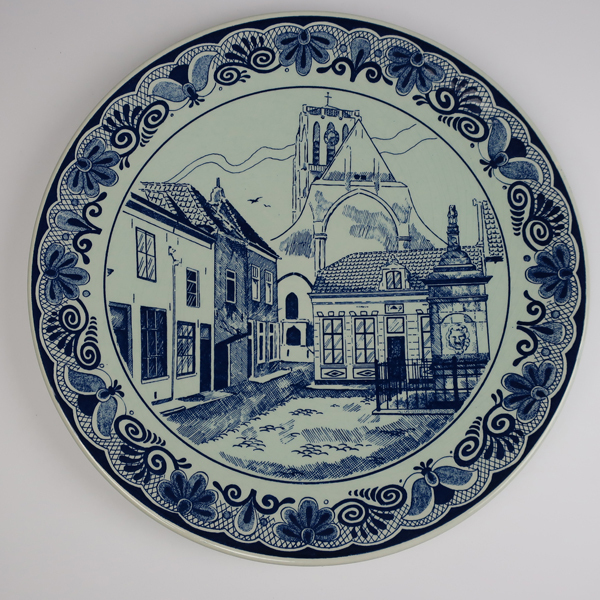 Bord, gedenkbord, met in blauw een geglazuurde voorstelling van het Wellerondom te Brielle met op de achtergrond de Catherijnekerk. Bord is gemaakt ter gegelegenheid van het afscheid van J.C. Poldervaart als voorzitter van N.V.O.B. (Nederlandse Vereniging Ondernemers in de Bouwsector) afdeling Voorne Putten en Rozenburg. Bord heeft aan achterkant twee gaatjes met daardoor een stuk ...