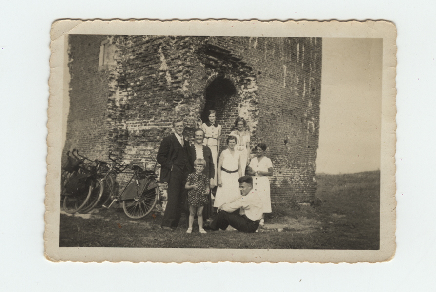 Foto, zwart/wit, met groepsfoto nabij de Stenen Baak, circa1936. Links naast de groep zijn enkele fietsen tegen de vuurtoren geplaatst. De Stenen Baak is in slechte conditie te zien aan de afgebrokkelde stukken steen. Foto voorzien van een geschulpte witte rand.