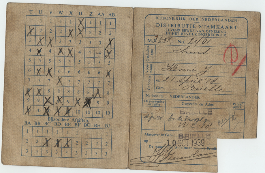 Distributie stamkaart van Henri Johannes Smit uitgegeven in gemeente Brielle op 10 oktober 1939. Rechtsonder is een hoek uitgeknipt.