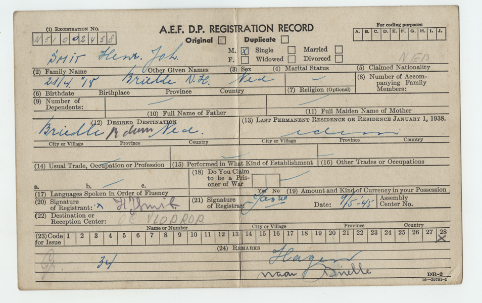 Document zijnde een medisch certificaat van H.J. Smit uitgegeven na medische inspectie op 9 mei 1945. Voorzien van stempel van 'Bureau voor Evacueerings en Repatrieeringszaken'.