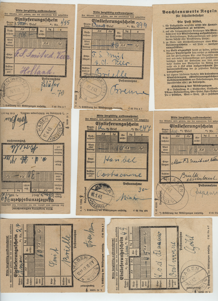 Set documenten of bonnen, 10 stuks, getiteld: Einlieferungschein' afkomstig van Henri Johannes Smit te Brielle uit 1942-1943. Bonnen zijn voorzien van stempels afkomstig van de Duitse plaats Hagen.