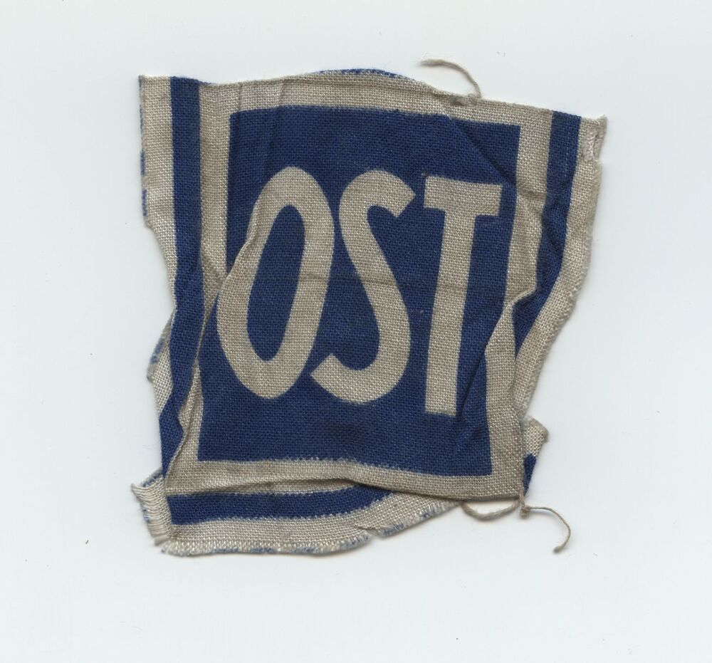 Label van textiel met daarop opschrift: 'OST' mogelijk gedragen door H.J. Smit te Brielle in periode van Tweede Wereldoorlog. H.J. Smit werkte als arbeider in het Duitse Hagen in periode van 1942-1945.
