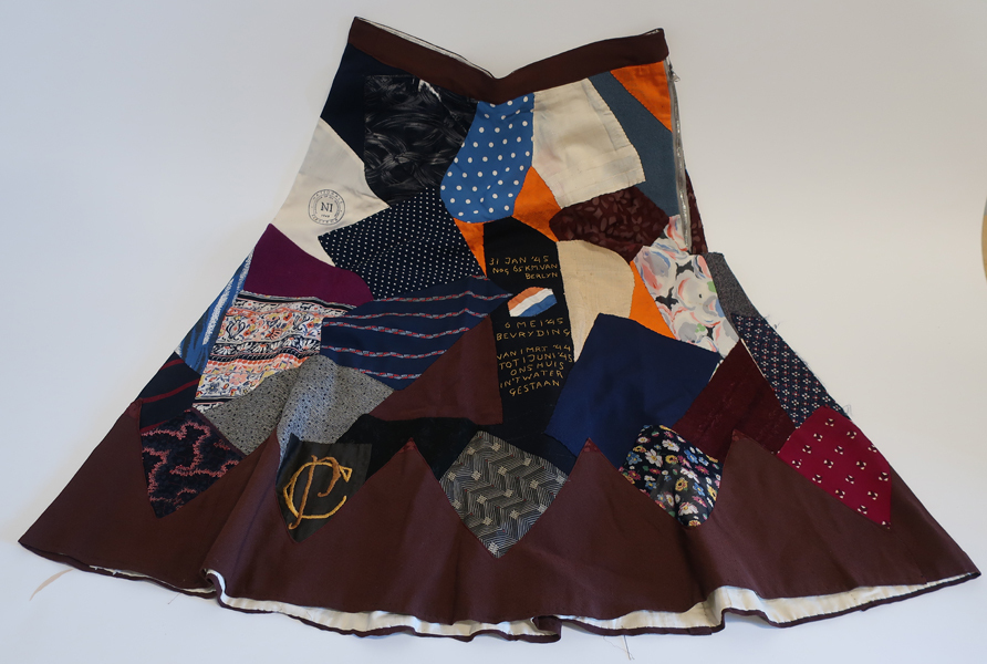 Feestrok van Nely van der Plas-Bakker. Bruine rok bestikt met veelkleurige lapjes stof, waaronder oranje, blauw, wit en lapjes met diverse motieven. Op de voorkant is op een donkerkleurig lapje een opschrift geborduurd met daar tussen de Nederlandse vlag. Links een stempel van de Nationale Feestrok. Onderaan de rok zijn de initialen CP geborduurd.