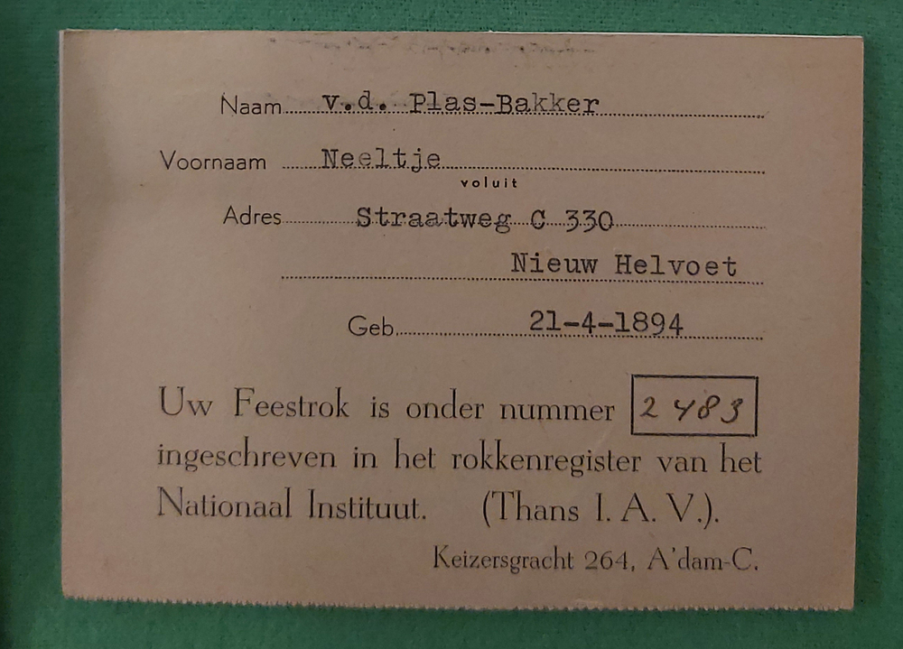 Registratiekaart feestrok Neeltje van der Plas-Bakker. Geregistreerd onder nummer 2483.