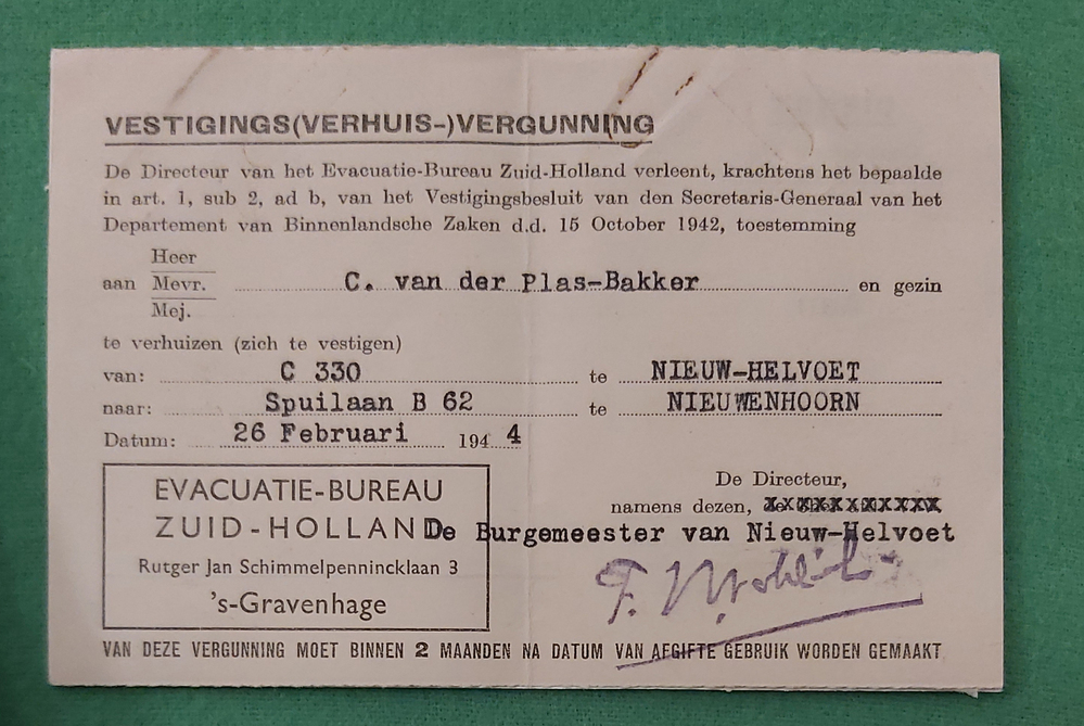 Registratiekaart gericht aan C. van der Plas-Bakker getiteld: Vestigings (verhuis-) vergunning. Afgegeven door burgemeester Niuew-Helvoet op 26 februari 1944 tijdens de inudatie.