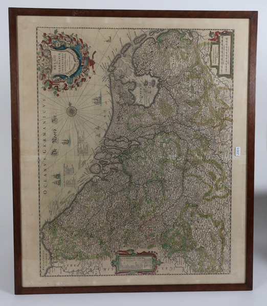 Kaart van de Nederlanden in smalle houten lijst. Rechtsonder schaal met opschrift: Milliaria Germanica Communia. Wapenschild met opschrift rechtsboven en legenda rechtsonder. Om de kaart goed te kunnen bekijken moet deze een kwartslag gedraaid worden.