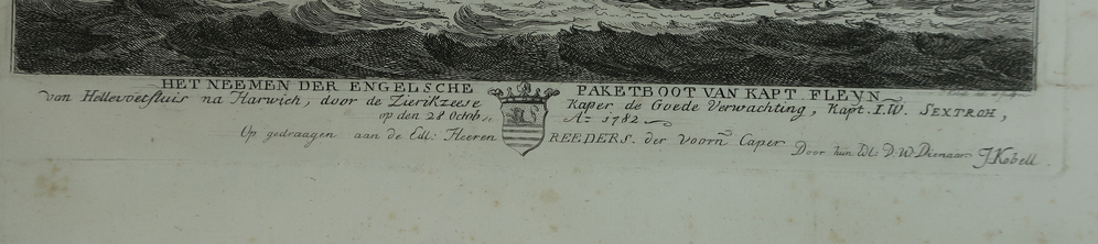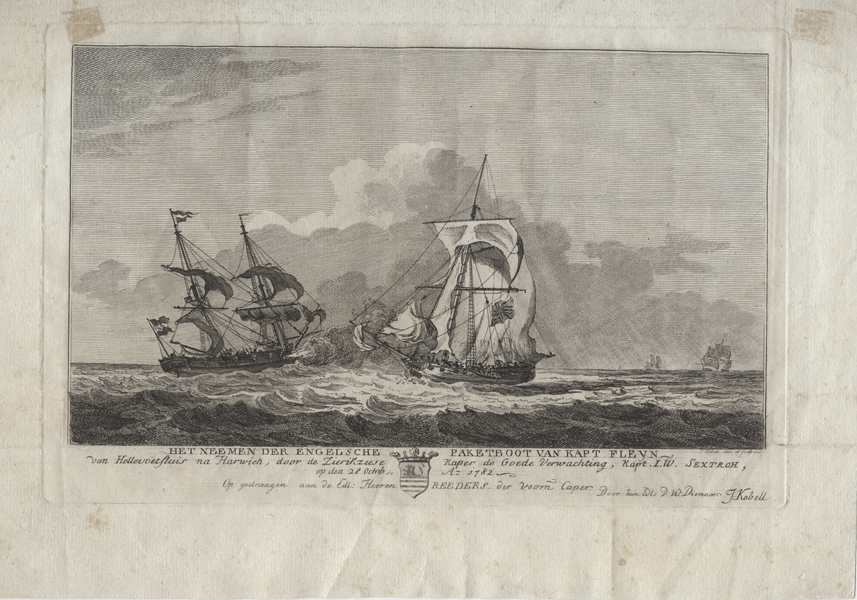 Prent, ets, getiteld: 'HET NEEMEN DER ENGELSCHE PAKETBOOT VAN KAPT FLEYN van Hellevoetsluis na Harwich, door de Zierikzeese kaper de Goede Verwachting, kapt. I.W. Sextroh, op den 28 Octob, A= 1782'. Op de voorgrond links twee schepen. Onder voorstelling opschrift met in het midden een wapenschild.