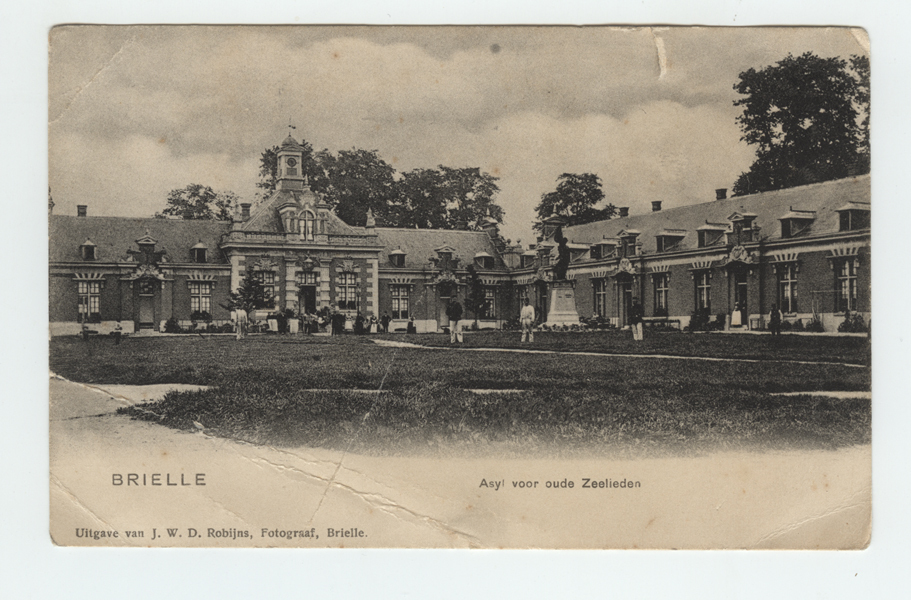 Ansichtkaart of briefkaart getiteld 'Asyl voor oude Zeelieden' te Brielle. Op de voorkant het Asylplein met op de achttergrond diverse personen staande in de tuin. Kaart is onbeschreven.