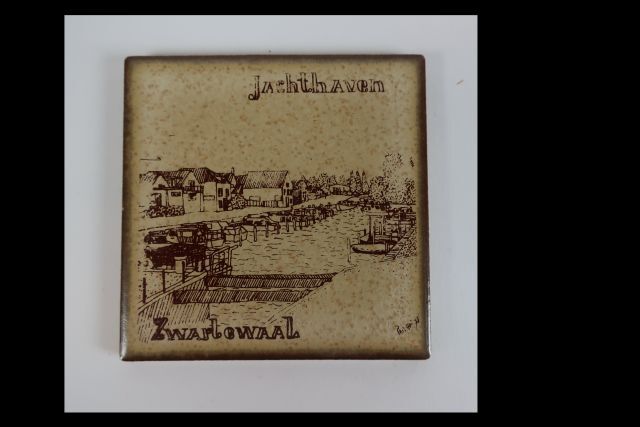 Tegel van Zwartewaal, beige met bruine opdruk, tonende de jachthaven van Zwartewaal