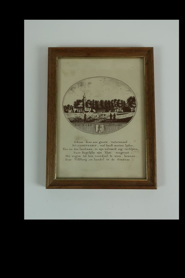 Ingelijste prent met in ovaal het dorpsgezicht van oostvoorne met daaronder een gedicht. Prent in smalle houten lijst met goudkleurige binnenrand.