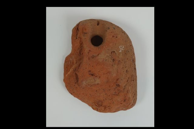 Drijver, roodbakkend aardewerk, gebruikt voor net of zeil. Deel van zijkant is beschadigd. Voorwerp voorzien van rond gat.