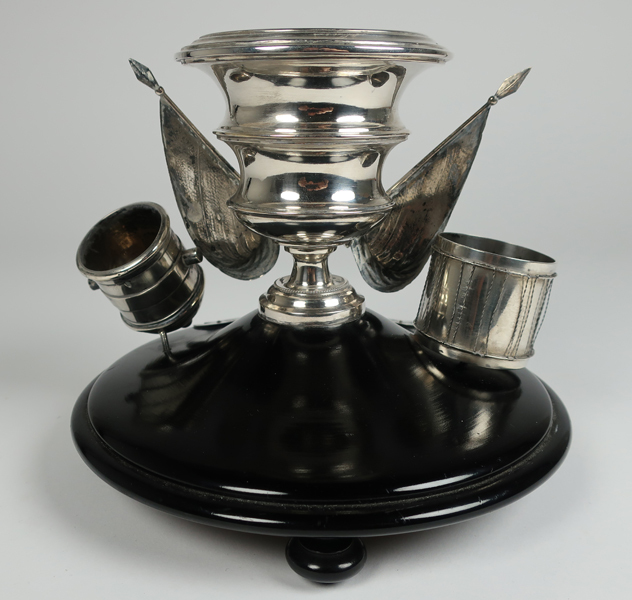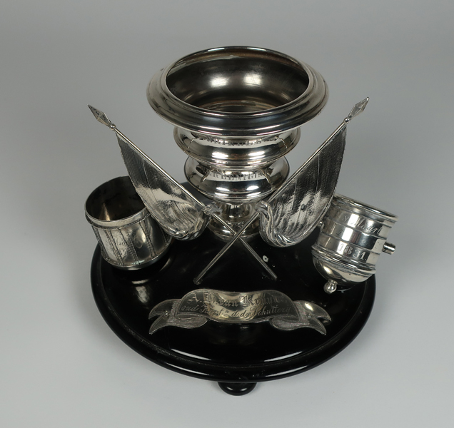 Zilveren tafelstel of tafelset afkomstig van de Brielse Schutterij. Tafelstel op zwart ronde voet voorzien van vier pootjes. In het midden een beker met daarvoor twee gekruiste vendels. Op de voorkant van beker het opschrift: 'BRIELLE VERENIGING'. Links van de beker een trommel met opschrift: '8 Maart 1876'. Rechts van de beker onderkant van een ...