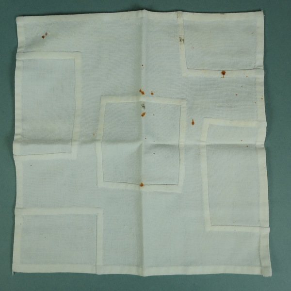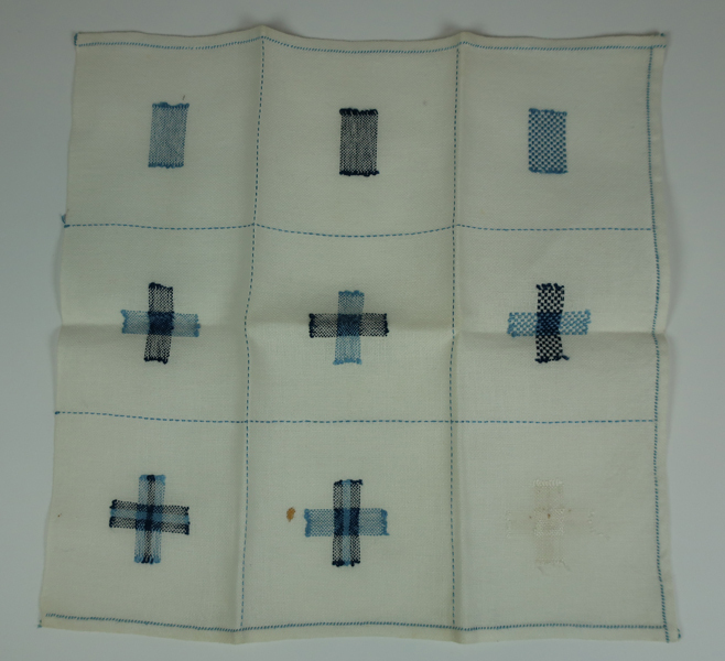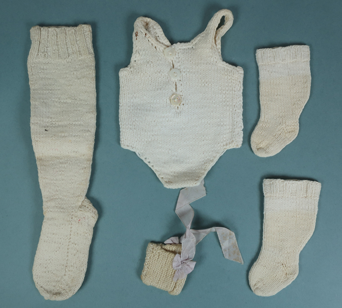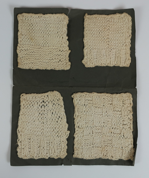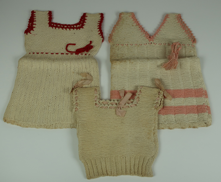 Diverse proefstukjes van textiel, 15 stukjes gemaakt door Reina Zoetemeijer. Set bestaat uit verschillende technieken waaronder: drie gebreide jurkjes of hemden met versierde randen, herstelwerk, knoop aanzetten, initalen 'RZ'borduren etc. Deze proefstukjes zijn gemaakt op de Meisjesvakschool te Brielle.