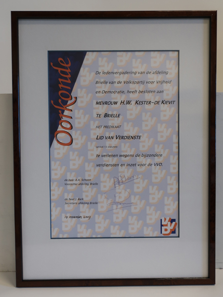 Oorkonde, ingelijst, VVD lid van verdienste H.W. Kester- de Kievit. Op achtergrond logo van politieke partij VVD. Ingelijst in smalle houten lijst.