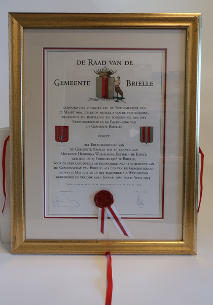 Oorkonde 'Ereburger Brielle'gericht aan mevrouw Henny Kester- de Kievit (1928-2019) in goudkleurige geprofileerde lijst. Oorkonde voorzien van de wapens van Brielle, Zwartewaal en Vierpolders. De lijst is voorzien van vier linten, zodat de lijst uit de bijbehorende kist kan worden gehaald. (inv. 6913.03)