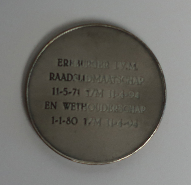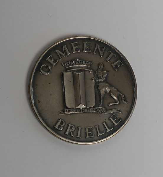 Medaille 'Ereburger Brielle' gericht aan mevrouw Henny Kester- de Kievit (1928-2019). Op de voorkant afbeelding van het wapen van Brielle. Keerzijde voorzien van inscriptie.