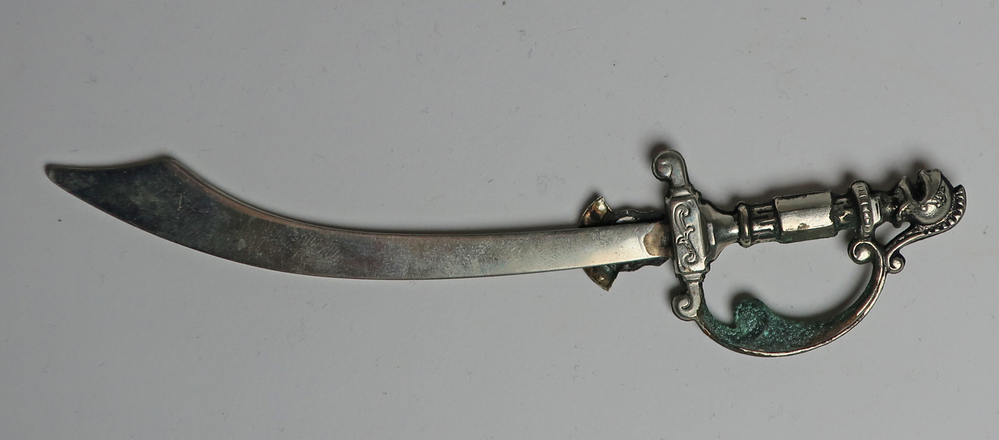 Zilverkleurige biefopener in de vorm van een sabel met onder het versierde heft het wapen van Zwartewaal. Het uiteinde van het heft is in vorm van een vis.