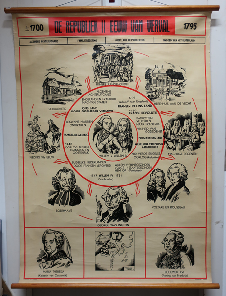 Schoolplaat met als titel; 1700 De republiek II eeuw van verval 1795. Op de schoolplaat staan enkele afbeelding die betrekking hebben op deze periode waaronder: Maria Theredia (keizerin van Oostenrijk), Willem IV en Willem V, Boerhave, Voltaire en Rousseau, kleding 18de eeuw, Schuurkerk, Franse revolutie.