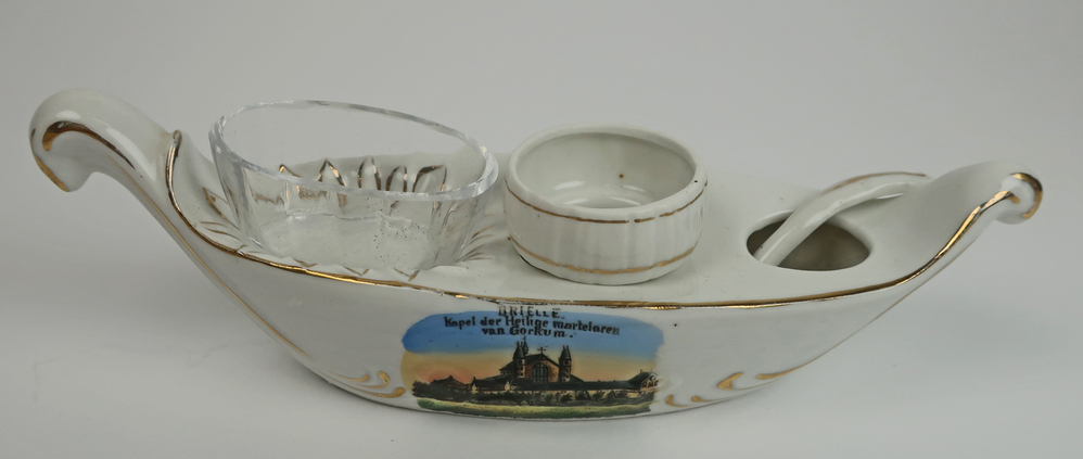 Peper- zout en mosterdstel in de vorm van een schip. Met een ovalen uitsparing met daarop een glazen bakje. In het midden een rond bakje voor de mosterd. Links een kleine ronde uitsparing voor mogelijk de lepel. De peper-zout en mosterstel is wit en langs randen versierd met goudkleurige biesjes. Op de voorkant in het ...