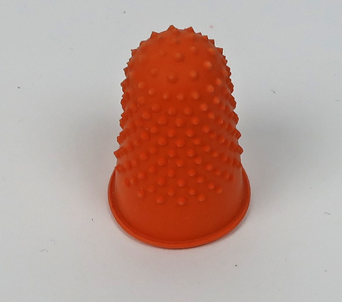 Oranje vingerhoed met bobbels aan uiteinde. Deze vingerhoed is gebruikt voor het tellen van de stembiljetten tijdens de Tweede Kamer Verkiezingen op 17 maart 2021. De verkiezingen stonden in het teken van de Corona crisis.