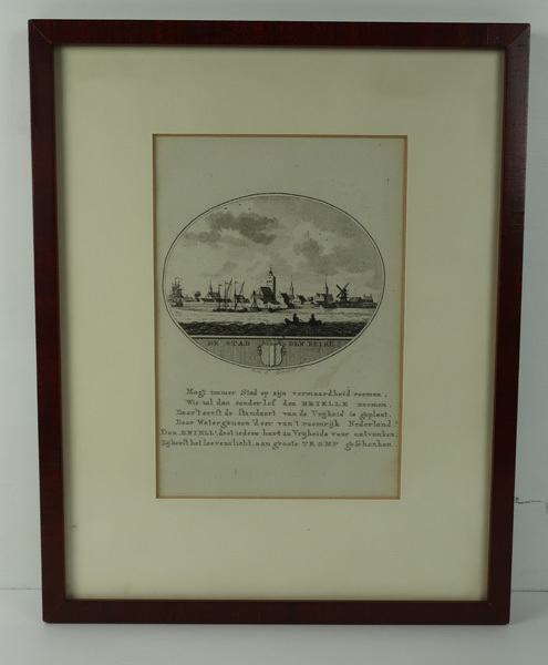 Prent met gezicht op Den Briel in ovaal. Op de achtergrond zicht op een aantal gebouwen en huizen van Brielle zoals de Sint Catharijnekerk. Op de voorgrond enkele schepen in het water. Geheel vooraan twee personen in een (roei)boot. Onder het water opschrift met in het midden het wapen van Brielle. Onder het ovaal een ...