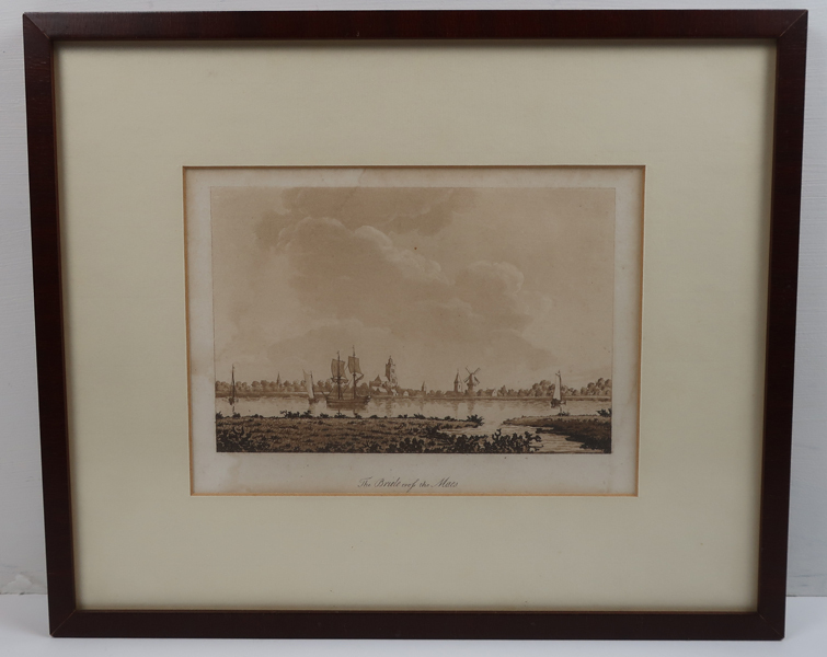 Prent, aquatint, met gezicht op Brielle vanaf de Maas. Op de achtergrond Den Briel met o.a. de Sint-Catharijnekerk en de molen. Daarvoor de Maas met een schip en enkele bootjes. Onder voorstelling opschrift met titel: The Briele cross the Maes.